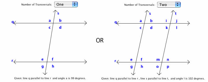 This activity allows the user to practice important angle vocabulary. Line l is parallel to line m. Also line r is parallel to line s. Each of the angles formed by the intersection of these four parallel lines can be classified as acute, obtuse, or right.