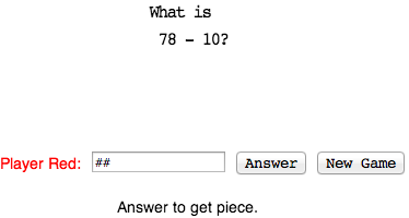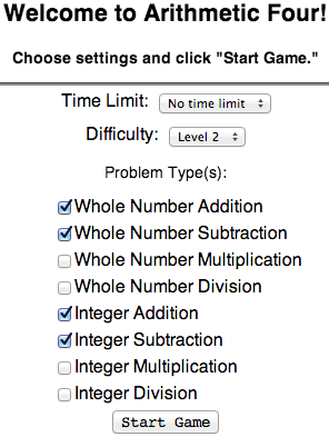 This activity allows two users to play a game where each player tries to connect four game pieces in a row before his or her opponent does. The players can choose to answer problems involving whole number and integer addition, subtraction, multiplication, and division. They can also choose the difficulty level.
