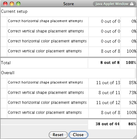 This will create a pop-up window that displays your number of correct shape assignments. The top half of the scorecard displays the results of your actions thus far on the current set only, while the bottom half of the scorecard displays your cumulative scores. Scores are divided into four categories: sorting by shape into horizontal grpahs, sorting by shape into vertical graphs, sorting by color into horizontal graphs, and sorting by color into vertical graphs. If, at any time, you wish to clear all current scores, you may do so by pressing the reset button.