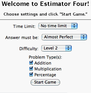 This activity allows two users to play a game of estimation where each player tries to connect four game pieces in a row before his or her opponent does. The players earn game pieces by accurately estimating the answers to various problems. Users can choose to estimate addition, multiplication, and percentage problems.