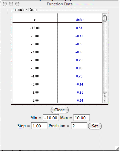 for the function. You can change these data values by entering a new minimum or maximum x