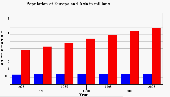 In this bar graph each pair of bars represents a year and each bar represents either Europe or Asia, while the y-axis shows the population in millions.