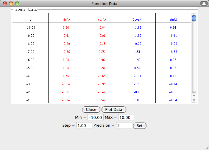 t^(1/n) t^(1/3) cube root of t absolute value abs(...) abs(3 - t) absolute value of three minus t e to the power of t exp(...) exp(t) e to the power of t sine sin(...) sin(t**2) sine of t squared cosine cos(...) cos(5 - t) cosine of five minus t tangent tan(...) tan(t) tangent t arcsine asin(...) 2*asin(t) two times arcsine t arccosine acos(...) acos(t) arccosine t arctangent atan(...) atan(t) arctangent of t hyperbolic sine sinh(...) sinh(1 - t) hyperbolic sine of one minus t hyperbolic cosine cosh(...) cosh(10/t) hyperbolic cosine of ten divided by t hyperbolic tangent tanh(...) tanh(t) hyperbolic tangent of t natural logarithm ln(...) ln(t) natural logarithm of t base 10 logarithm log(...) log(t + 5) base ten logarithm of t plus five