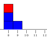 When dragging a box to change one of the data points, click and drag the top box in a column for which you wish to change. The box will change from blue to red to indicate which box is being manipulated. Drag the box right or left and release the mouse when it appears in the column you want. Note the values in the text box as well as the pointers for mean, median, and mode also dynamically update as the box is dragged. Pictured below is a box before dragging and after dragging.