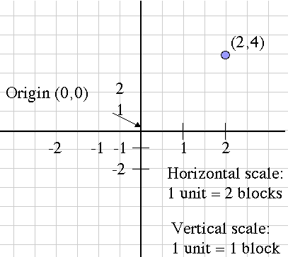 Notice that the horizontal and vertical scales are different, but each one considered alone is evenly spaced. Also, the blue point is labeled with its Cartesian coordinates , the horizontal and vertical movement from the origin, in that order. This is the mathematical convention for naming points.