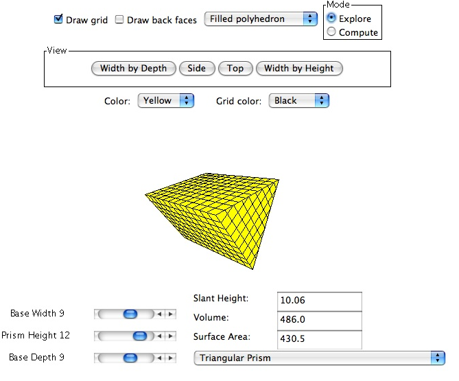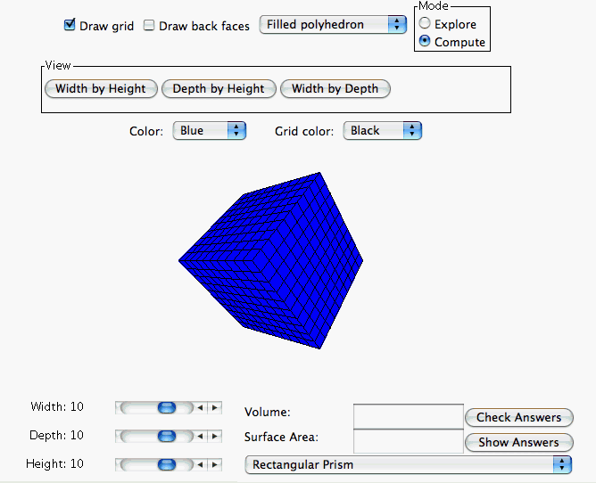 This activity allows the user to manipulate three-dimensional polyhedra to experiment with surface area and volume.