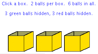 This activity allows the user to simulate pulling red and green balls out of three boxes. The boxes are pre-arranged so that there are two red balls in one box, two green balls in another, and one green and one red ball in the third. The user can shuffle the order of the boxes and the order of the balls in the boxes.