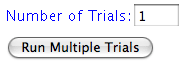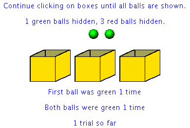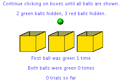 To run in single trial mode, click on one of the boxes to see if the first ball is green. If it is, click on the box again to see if the second ball is green also. A count will be kept of the results. To run in multiple trial mode, enter the number of trials desired in the box and click on the run multiple trials button.