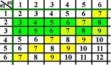 Let us compute P(A) and P(B) (the probabilities of Events A and B) using the most straightforward method: counting chances. That is, we can count the favorable situations and find the total number of outcomes. The following table lists the outcomes and sums of the dice in case of each outcome: