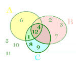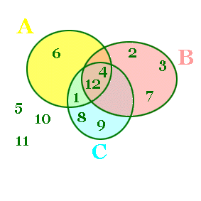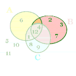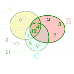 Mentor: Let us consider one more game as an example. In this game, four players share a twelve-sided die. Player A (Anton) wins if the die shows 1, 4, 6, or 12. Player B (Boris) wins if the die shows 2, 3, 4, 7 or 12. Player C (Chris) wins if the die shows 1, 4, 8, 9, or 12. Player D (Dorothy) wins if none of the other players win. I will describe several events to demonstrate how convenient the diagrams can be. First try to find the probabilities without looking at the diagrams: this way you will see which of them are hard to find without the diagrams. Find the probabilities of the events listed in the table. The corresponding diagrams and the answers are also in the table. Instead of writing: "The probability of Event A is .33" we can write simply P(A)=.33 The answers follow from counting the outcomes, out of twelve total.