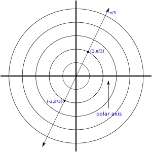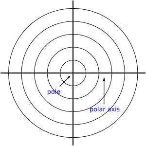 Mentor: The polar coordinate system has axes similar to the Cartesian system and a point like the origin except that it is called the pole. It also has a ray that extends horizontally through the pole called the polar axis. Instead of a square grid, there are concentric circles centered at the pole that get uniformly bigger and radiate out from the pole. Polar coordinate plane looks like this: