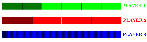 Mentor: Let us think about a different problem for a while. It will help you see some things. Suppose we have three players again, only now they play a different game. Each of them has a long rectangular box having the same length and width, a ball and a monkey. Each monkey throws a ball in each player's box in no particular manner, so it lands at a random spot inside the box. The bottoms of the boxes are divided into equal parts by thin lines. The parts are colored by light and dark colors, as shown on the picture. The box of Player 1 is divided into 6 parts, 2 of them dark; the box of Player 2 is divided into 4 parts, one of them dark; and the box of Player 3 is divided into 100 parts, five of them dark. If the ball lands in the dark part of the box, the player wins. Which player has better chances of winning?