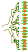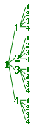 Student: Well, it is useful for counting the total number of outcomes. There are four "trunks" (for the possible numbers on the first die), and each has four "branches" (for the possible numbers on the second die), and each has four "twigs" (for the possible numbers on the third die). An outcome is formed as we go from a trunk to a brunch to a twig. There are as many outcomes as there are twigs: 4*4*4=64. Wow! It sounds like an old puzzle!